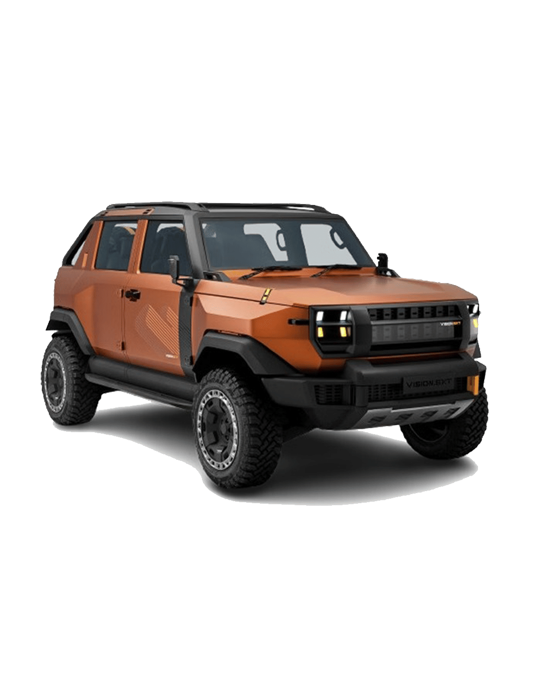 Up front, the SXT features a thick rectangular grille with vertical slats, flanked by stacked LED headlamps and aggressive DRLs. The bonnet is muscular with exposed hardware, while the bumper integrates a wide air intake and silver skid plate for an unmistakable off-road vibe.From the side, its boxy silhouette, squared-off wheel arches, exposed hinges, and blocky alloys with all-terrain tyres highlight its purpose-built stance. The C-pillar design marks its biggest departure from the Vision T - behind it lies a short pickup bed with roll bars, angular tailgate styling, and strapped spare wheels.At the rear, slim vertical LED lamps linked by a black panel with “Vision SXT” branding give it a futuristic yet tough character. The chunky bumper, integrated skid plate, and high-set stop lamps further enhance its off-road appeal. Dual-tone shades (such as orange/black) complete the lifestyle-truck persona.