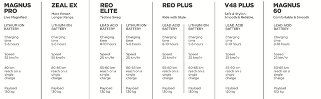 The Reo Elite looks much sportier than the Reo Plus. It is designed for urban millennials and looks quite aggressive. The Reo Elite looks sleek and gets an all-LED digital display. It gets a 20 Ah Lead-Acid battery or a 24 Ah Lithium-ion battery. It can also do a maximum speed of 25 km/h with a range of 55 km on a full charge. The lead-acid battery takes about 8-10 hours while Li-ion battery pack takes about 5-6 hours to charge completely.