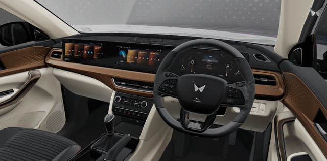 Inside the cabin, the XUV 7XO AX delivers one of its biggest surprises. Mahindra offers the triple-screen dashboard layout as standard, consisting of three 12.3-inch displays for the infotainment system, digital instrument cluster, and co-passenger screen. This immediately sets the base variant apart from most rivals in the segment. That said, Mahindra does differentiate the AX trim through material choices. The cabin features hard plastics and fabric upholstery, unlike the leatherette and soft-touch finishes available on higher trims. The steering wheel is a conventional multi-function unit carried over from the previous generation rather than the new two-spoke design. The interior theme leans towards darker shades, giving it a more functional feel compared to the lighter dual-tone cabins offered higher up.