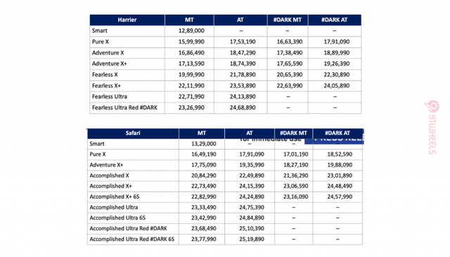 The petrol-powered Harrier and Safari are available in multiple trims, including Smart, Pure X, Adventure, Fearless, and Accomplished variants, with both manual and automatic gearbox options. Dark Edition variants are also offered on select trims, adding a sportier visual appeal.