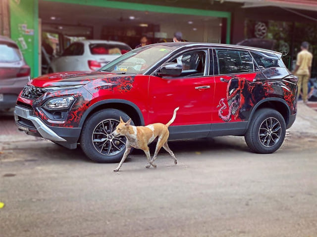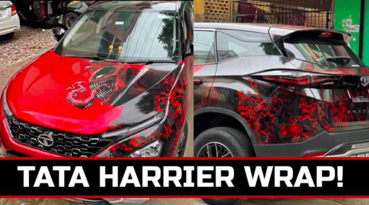 Tata Harrier is one of the most special looking SUV in the Indian market and it has praised by many. Tata's design team has done a stupendous job in designing the Harrier and also the Altroz. What we have here today is a custom wrapped Tata Harrier with Venom theme. It just looks astounding thanks to the red-wrap and Venom stickers.